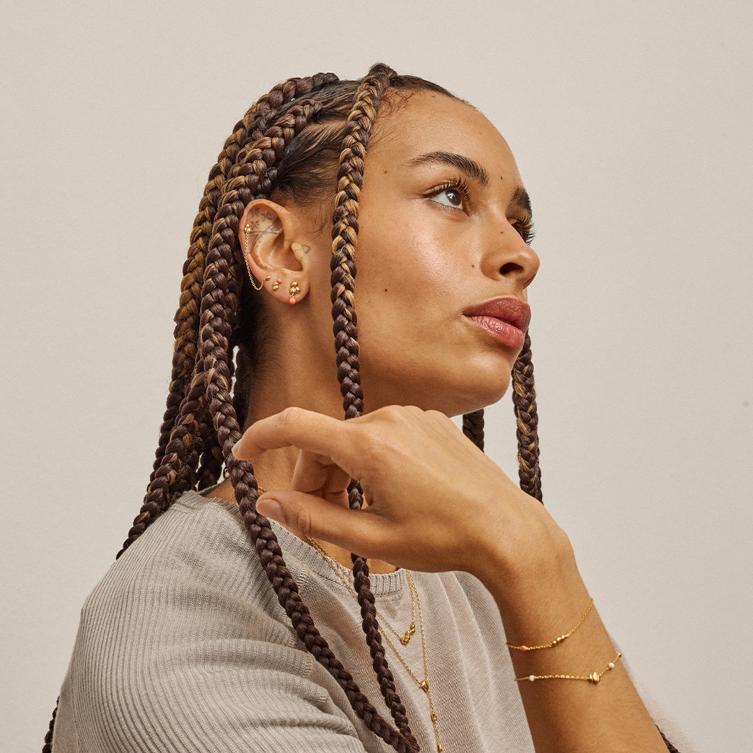 Alle smykkene i kolleksjonen er laget i materialer av høy kvalitet, blant annet 18 karat forgylt sterlingsølv. Vi bruker 100 % resirkulert sterlingsølv, slik at du kan bære favorittene dine med omtanke – både for stil og for fremtiden.