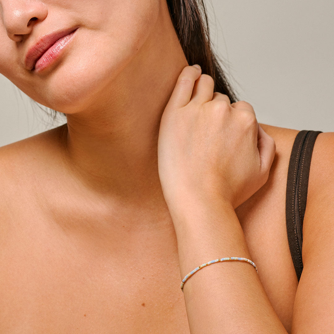 Om smykket: Fargekombinasjonen Skyline består av delikate grønne og blå nyanser, noe som gir et rolig uttrykk til vår Petra armbånd. Fargene passer alle hudtoner og minner om himmelens mange forskjellige nyanser.