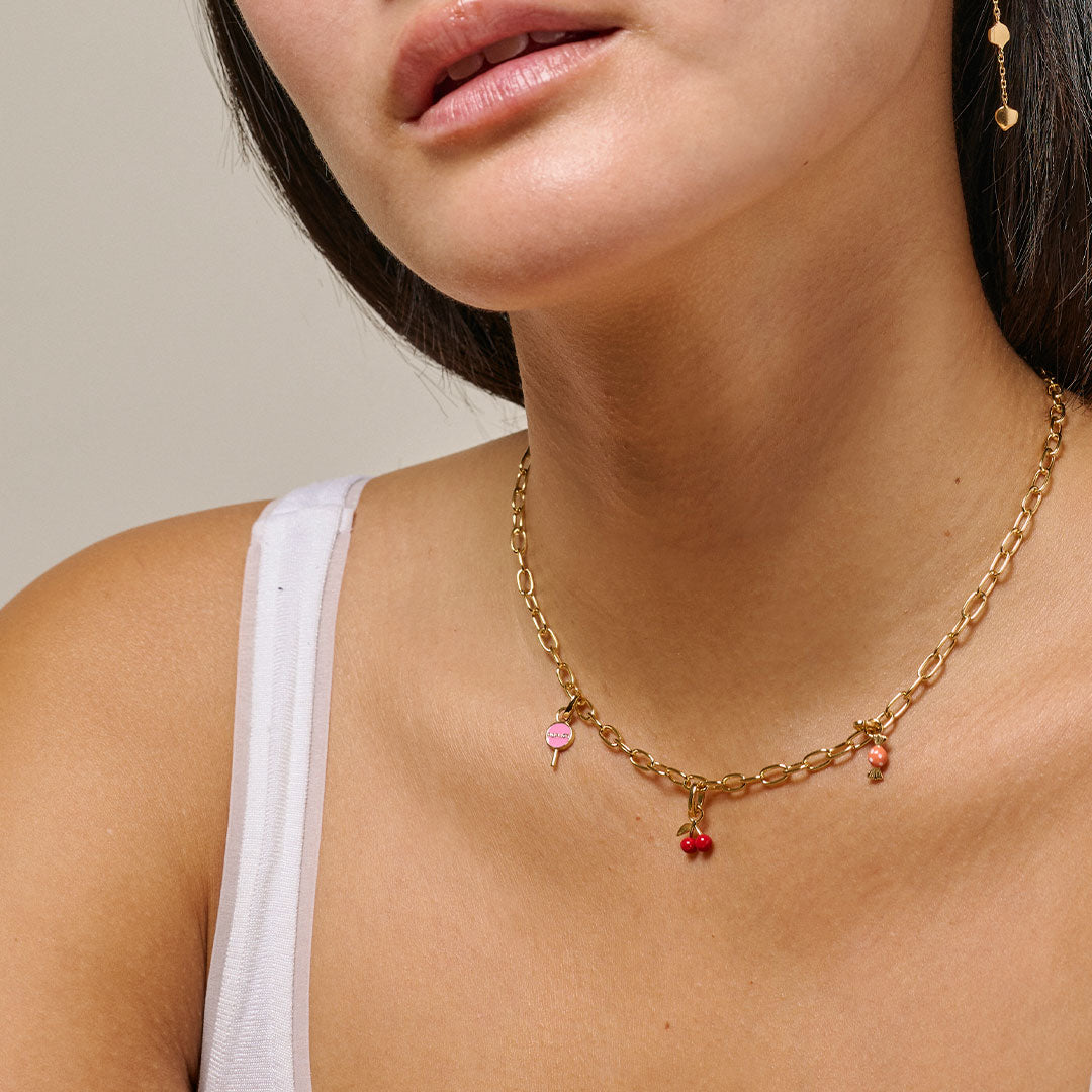Om smykket: Den koralfargede emaljen med hvite prikker fremstår her som et sukkersøtt og morsomt element som vakkert utfyller varmen fra gullet. Fargene minner om sommer, sol, lykkelige dager, og morsomme opplevelser.