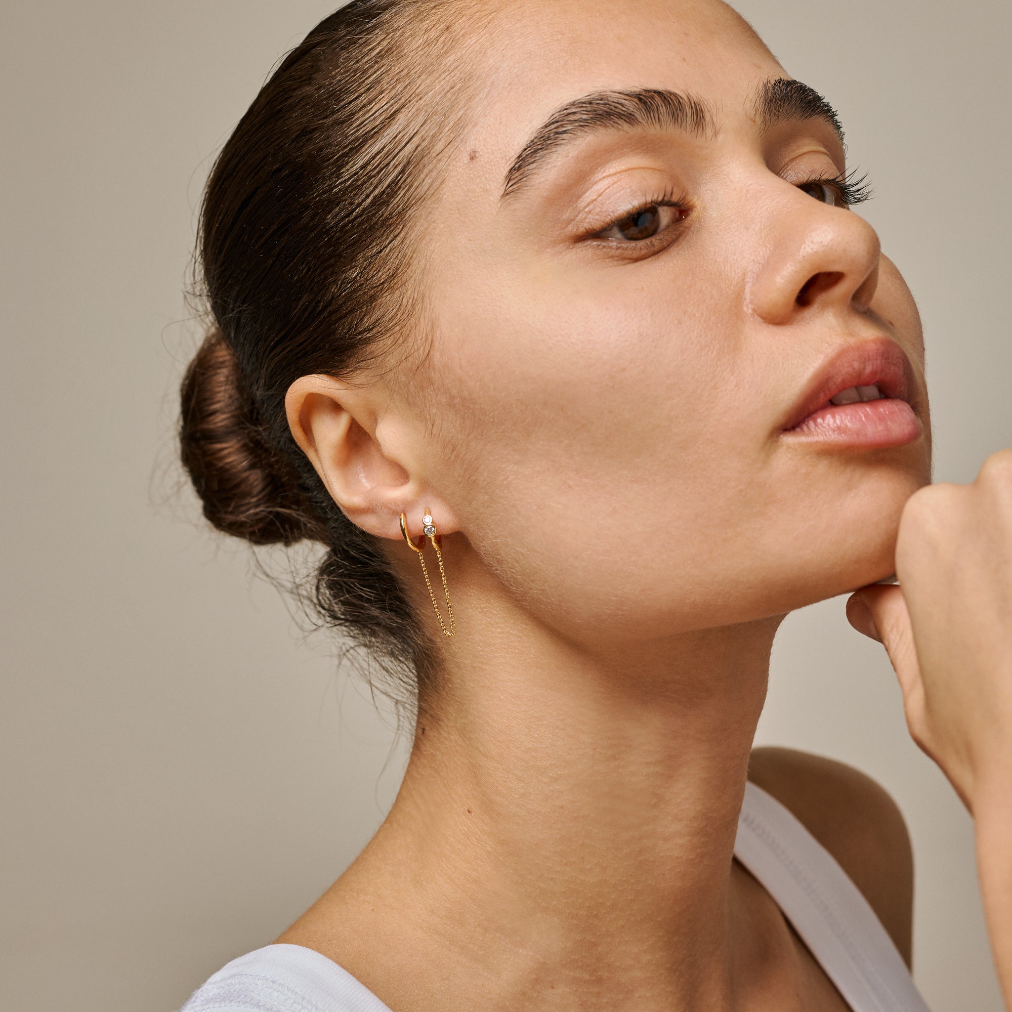 Nova Chain Hoops er en moderne tolkning av den klassiske hoopen - med et overraskende tvist. Denne unike dobbelte hoopen består av to små, polerte hooper koblet sammen med en fin kjede, og skaper illusjonen av to separate øredobber, men i virkeligheten henger sammen som en. En hoopen er prydet med to klare cubic zirkonia-steiner, som legger til glans og eleganse. Designet er spesielt laget for de med to piercinger i samme øre, og kombinerer minimalistisk kjede-ørepynt med et røff, men raffinert uttrykk. Begge hooper har klikklåser, noe som gjør dem enkle å ta på og sikre å bruke. Nova Chain er perfekt for de som elsker å style ørepiercinger kreativt, og ønsker noe annerledes, men likevel elegant. Bruk Nova Chain alene som et statement-stykke - eller bland det med små pinner og hooper for en personlig, lagvis look. Obs: Nova Chain selges individuelt.