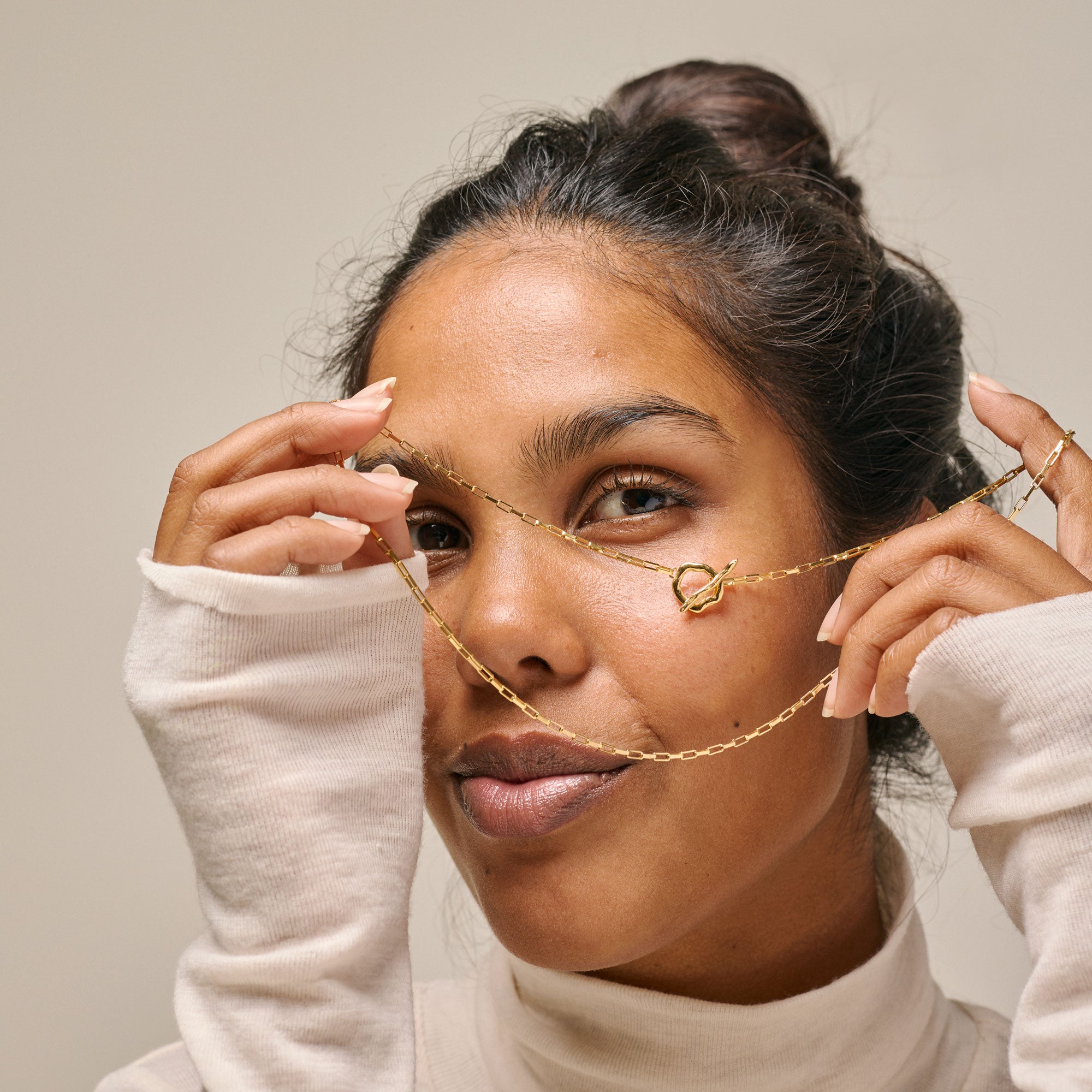 Om smykket:De bølgede, organiske lenkene på Noel-halskjedet passer perfekt med den geometriske uttrykket av de firkantede lenkene på kjedet, og skaper en feminin og modig uttrykk. Noel-halskjedet har en unik design, som gjør den oppsiktsvekkende for både hverdagsbruk og fest. Halskjedet lukkes kun foran, og kan styles på flere forskjellige måter.