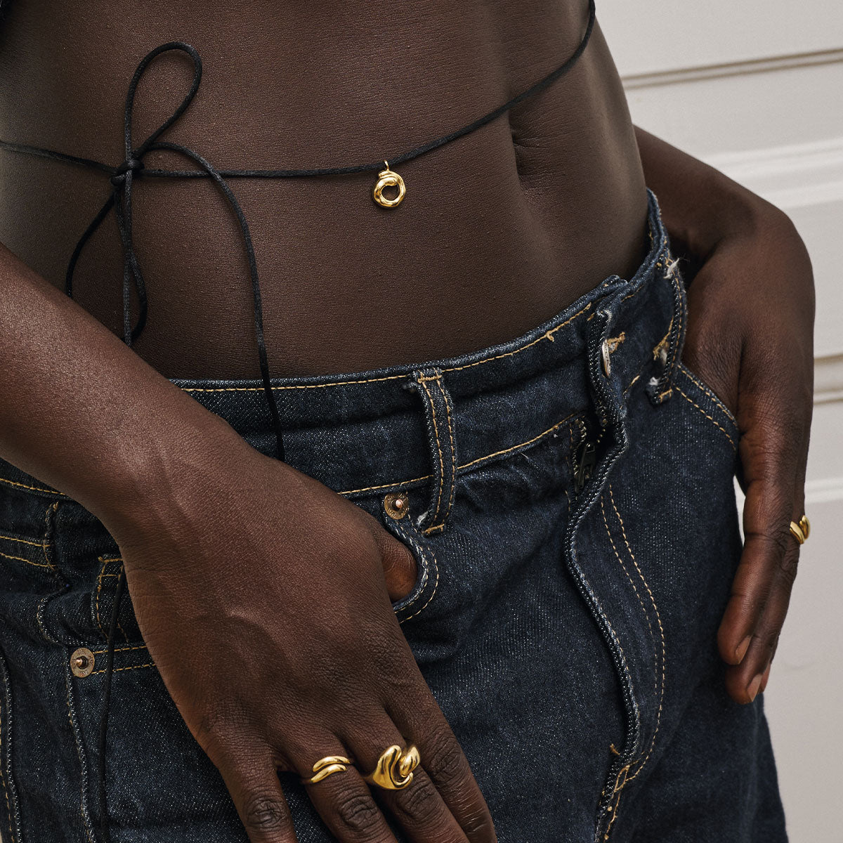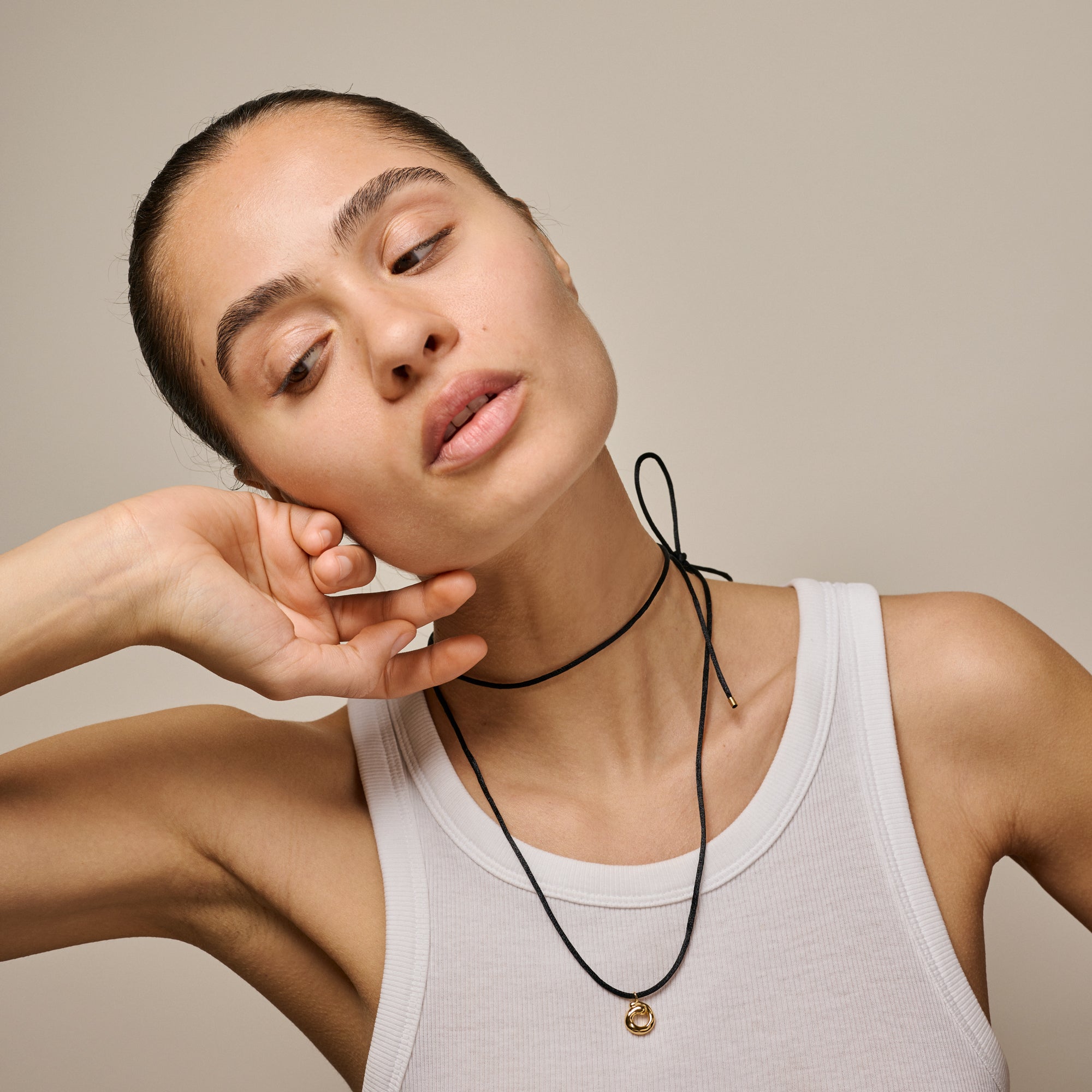 Om smykket:Sora Tie halskjede har et eksklusivt og kunstnerisk vedheng med en organisk form og myk bevegelse i uttrykket. Vedhenget leveres med en svart nylonsnor, ferdig med delikate gull detaljer for et gjennomtenkt og stilig helhetsinntrykk. Du kan binde snoren akkurat som du ønsker - høyt på halsen for et kult choker-utseende eller lavere nede for en mer avslappet eleganse. Vedhenget kan også tas av og brukes på en av dine favorittkjeder hvis du foretrekker et mer klassisk utseende - eller vil legge til variasjon i stilen din. Sora Tie er smykket som inviterer til personlig stil og lek med form. En moderne uttalelse med enkelhet, bevegelse og funksjon i perfekt balanse.