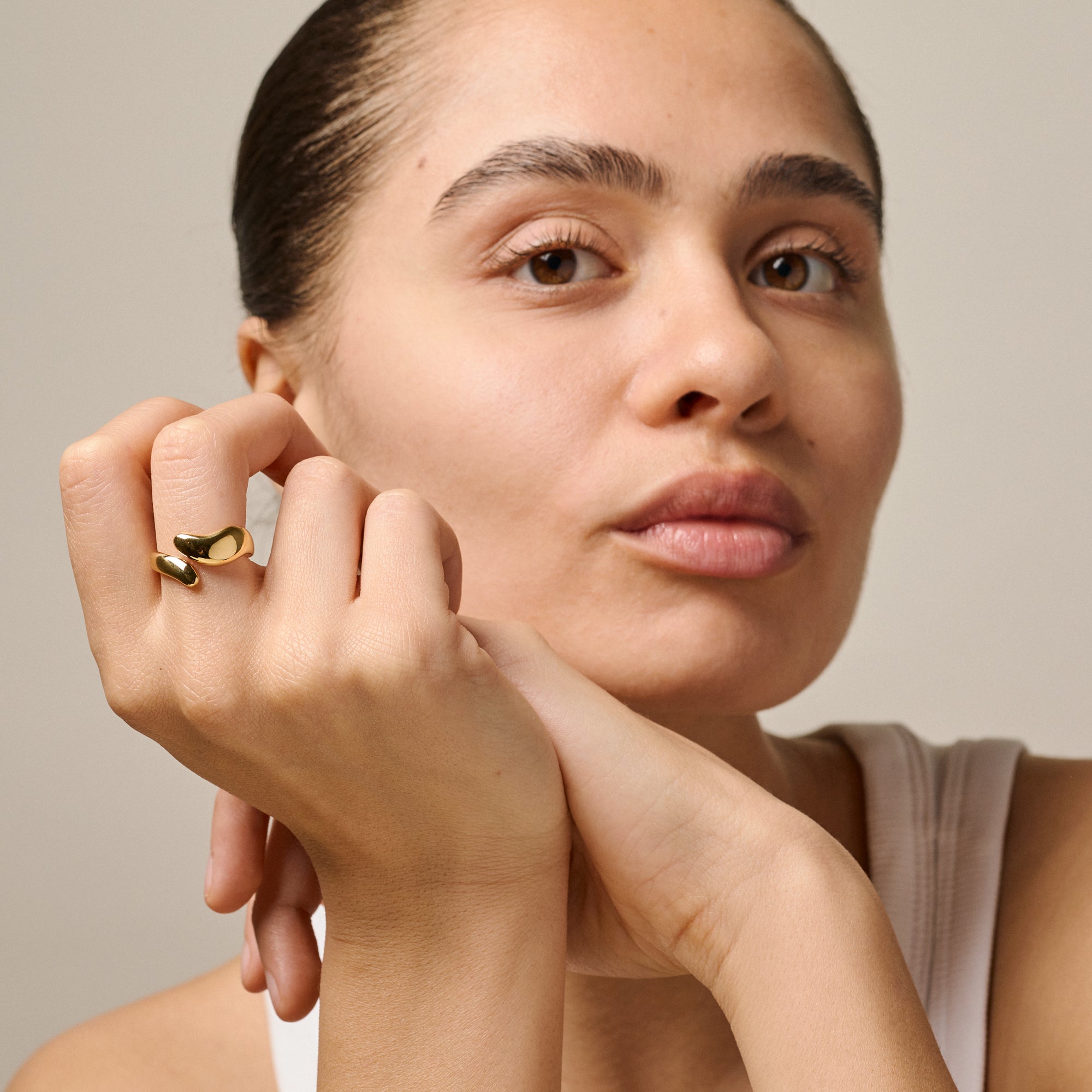 Om smykket: Neli Ring, som er belagt med 18 karat gull, er designet med inspirasjon fra naturens myke bevegelser. Den har en elegant, åpen silhuett med voluminøse former som omslutter fingeren. Den blanke gulloverflaten gir et eksklusivt og moderne uttrykk, mens den justerbare størrelsen sikrer at den passer perfekt for deg – uansett anledning. Neil ringen finnes også i sølv.